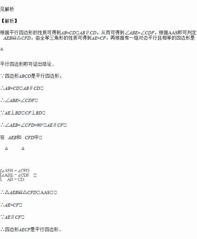 如图,BD是?ABCD的对角线,AE⊥BD于E,CF⊥BD于F,求证:四边形AECF为平行四边形.