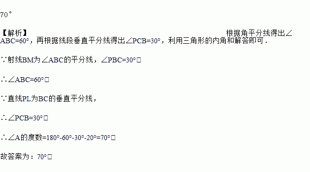如图,在锐角三角形ABC中,直线PL为BC的垂直平分线,射线BM为∠ABC的平分线,PL与BM相交于P点.若∠PBC=30°,∠ACP=20°,则∠A的度数为______.