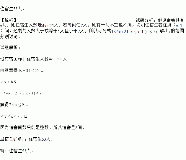 某校高一新生中有若干住宿生,分住若干间宿舍,若每间住4人,则还有21人无房住;若每间住7人,则有一间不空也不满,已知住宿生少于55人,求住宿生人数.