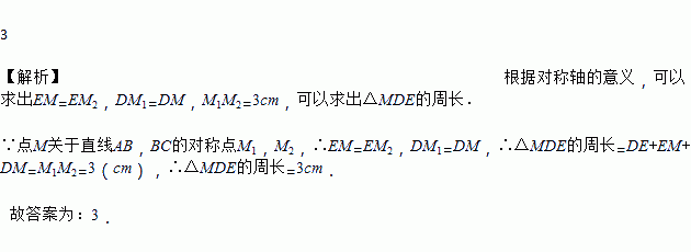 如图,已知点M是∠ABC内一点,分别作出点M关于直线AB、BC的对称点M1、M2,连接M1M2分别交AB于点D,交BC于点E,若M1M2=3cm,则△MDE的周长为____________cm.