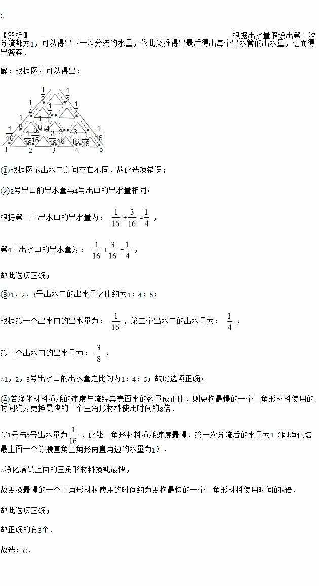 ÈçͼËùʾΪһ¸öÎÛË®¾»»¯ËþÄÚ²¿£¬ÎÛË®´ÓÉÏ·½Èë¿Ú½øÈëºó£¬Á÷¾ÐÎÈçµÈÑüÖ±½ÇÈý½ÇÐεľ»»¯²Ä–’±íÃæ£¬Á÷ÏòÈçͼÖмýÍ·Ëùʾ£¬Ã¿Ò»´ÎË®Á÷Á÷¾Èý½ÇÐÎÁ½ÑüµÄ»ú»áÏàͬ£¬¾¹ýËIJ㾻»¯ºóÁ÷Èëµ×²¿µÄ5¸ö³ö¿ÚÖеÄÒ»¸ö£®ÏÂÁÐÅжϣº¢Ù5¸ö³ö¿ÚµÄ³öË®Á¿Ïàͬ£»¢Ú2ºÅ³ö¿ÚµÄ³öË®Á¿Óë4ºÅ³ö¿ÚµÄ³öË®Á¿Ïàͬ£»¢Û1£¬2£¬3ºÅ³öË®¿ÚµÄ³öË®Á¿Ö®±ÈԼΪ1£º4£º6£»¢ÜÈô¾»»¯²Ä–’ËðºÄµÄËÙ¶ÈÓëÁ÷¾Æä±íÃæË®µÄÊýÁ¿³ÉÕý±È£¬Ôò¸ü»»×îÂýµÄÒ»¸öÈý½ÇÐβĖ’ʹÓõÄʱ¼äԼΪ¸ü»»×î¿ìµÄÒ»¸öÈý½ÇÐβĖ’ʹÓÃʱ¼äµÄ8±¶£®ÆäÖÐÕýÈ·µÄÅжÏÓУ¨¡¡£©¸ö£®