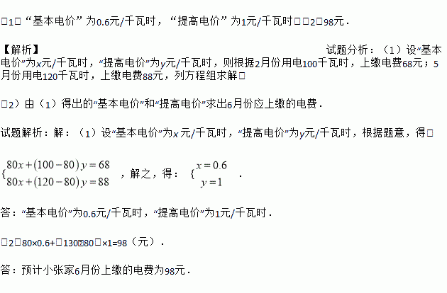 (1)“基本电价”为0.6元/千瓦时,“提高电价”为1元/千瓦时;(2)98元. 【解析】试题分析:(1)设“基本电价”为x元/千瓦时,“提高电价”为y元/千瓦时,则根据2月份用电100千瓦时,上缴电费68元;5月份用电120千瓦时,上缴电费88元,列方程组求解; (2)由(1)得出的“基本电价”和“提高电价”求出6月份应上缴的电费. 试题解析:【解析】 (1)设“基本电价”为...