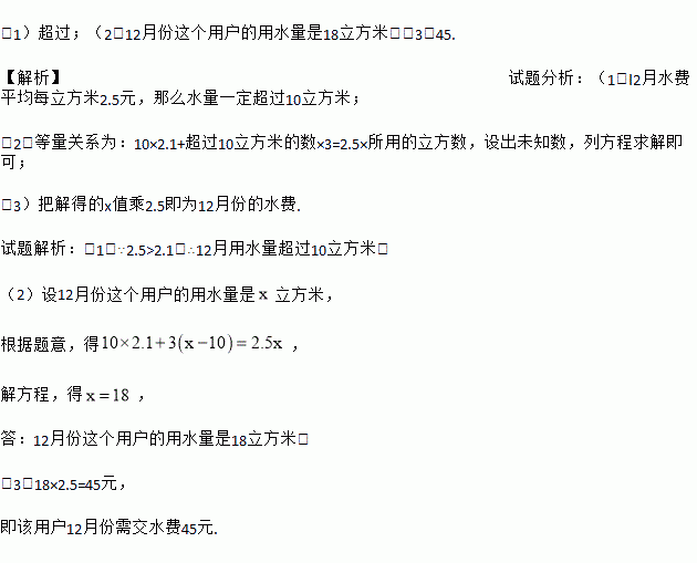 £¨1£©³¬¹ý£»£¨2£©12Ô·ÝÕâ¸öÓû§µÄÓÃË®Á¿ÊÇ18Á¢·½Ã×£»£¨3£©45. ¡¾½âÎö¡¿ÊÔÌâ·ÖÎö£º£¨1£©l2ÔÂË®·Ñƽ¾ùÿÁ¢·½Ã×2.5Ôª£¬ÄÇôˮÁ¿Ò»¶¨³¬¹ý10Á¢·½Ã×£» £¨2£©µÈÁ¿¹ØÏµÎª£º10¡Á2.1+³¬¹ý10Á¢·½Ã×µÄÊý¡Á3=2.5¡ÁËùÓõÄÁ¢·½Êý£¬Éè³öδ֪Êý£¬Áз½³ÌÇó½â¼´¿É£» £¨3£©°Ñ½âµÃµÄxÖµ³Ë2.5¼´Îª12Ô·ݵÄË®·Ñ. ÊÔÌâ½âÎö£º£¨1£©¡ß2.5>2.1£¬¡à12ÔÂÓÃË®Á¿³¬¹ý10Á¢·½Ã×£»...