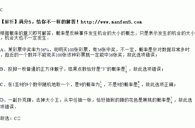 D. 一副扑克牌,去掉大小王,从中任抽一张,恰好抽到的牌的花色是黑桃的概率是![]()