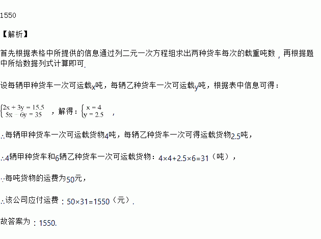 现打算租用该公司4辆甲种货车和6辆乙种货车,可一次刚好运完这批货物.如果每吨运费为50元,该公司应付运费________元.