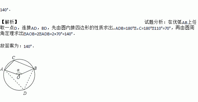如图,在⊙O中,点A、B、C在⊙O上,且∠ACB=110°,则∠α= .