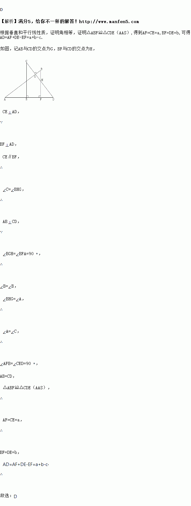 如图,AB⊥CD,且AB=CD.E、F是AD上两点,CE⊥AD,BF⊥AD.若CE=a,BF=b,EF=c,则AD的长为( )
