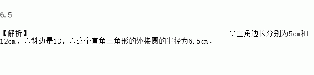 已知直角三角形的两直角边分别为5,12,则它的外接圆半径R= 。
