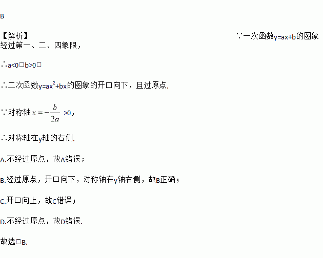 已知一次函数y=a+b的图象经过第一、二、四象限,则在平面直角系数中二次函数y=a2+b的图象大致是 ( )