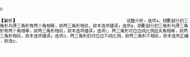 如图,△ABC中,∠A=78°,AB=4,AC=6.将△ABC沿图示中的虚线剪开,剪下的阴影三角形与原三角形不相似的是( )