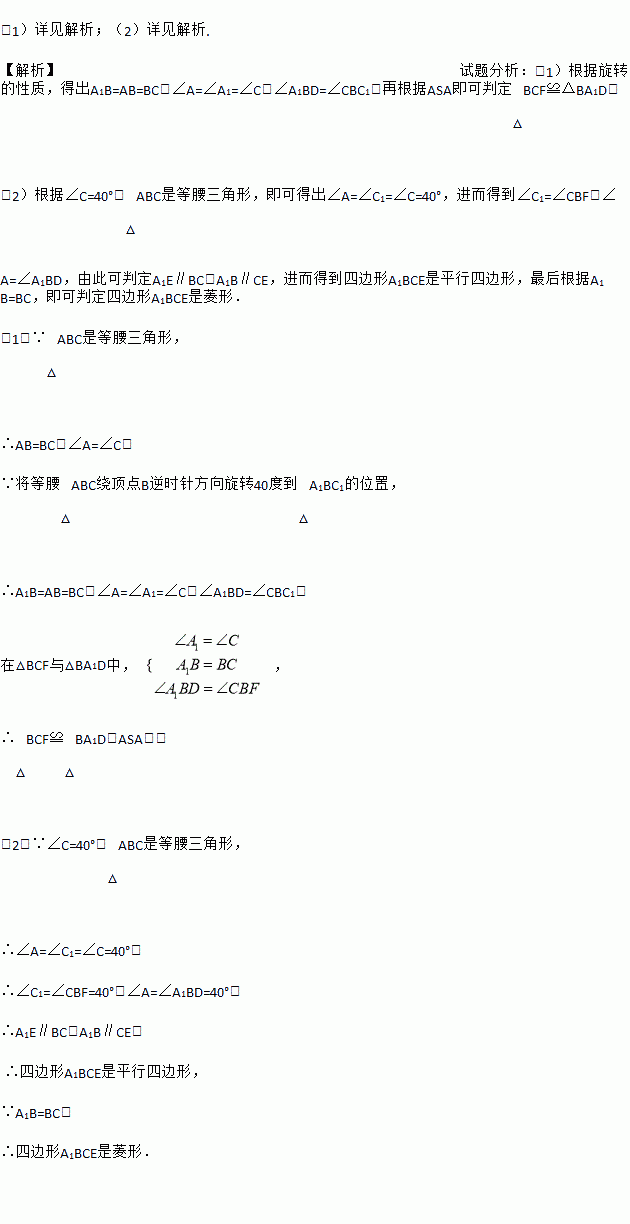 (1)详见解析;(2)详见解析. 【解析】试题分析:(1)根据旋转的性质,得出A1B=AB=BC,∠A=∠A1=∠C,∠A1BD=∠CBC1,再根据ASA即可判定△BCF≌△BA1D; (2)根据∠C=40°,△ABC是等腰三角形,即可得出∠A=∠C1=∠C=40°,进而得到∠C1=∠CBF,∠A=∠A1BD,由此可判定A1E∥BC,A1B∥CE,进而得到四边形A1BCE是平行四边形,...