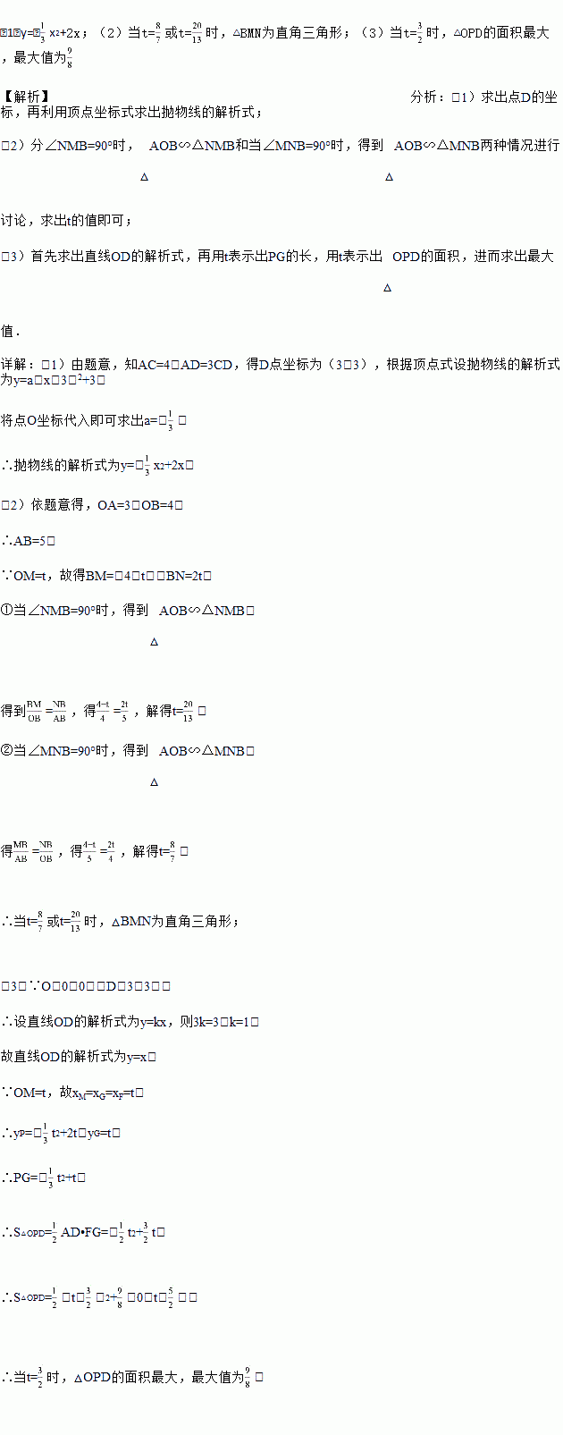 (3)在图2中,过点M做y轴的平行线,分别交抛物线和线段OD于P、G两点,当t为何值时,△ODP的面积最大?最大值是多少?