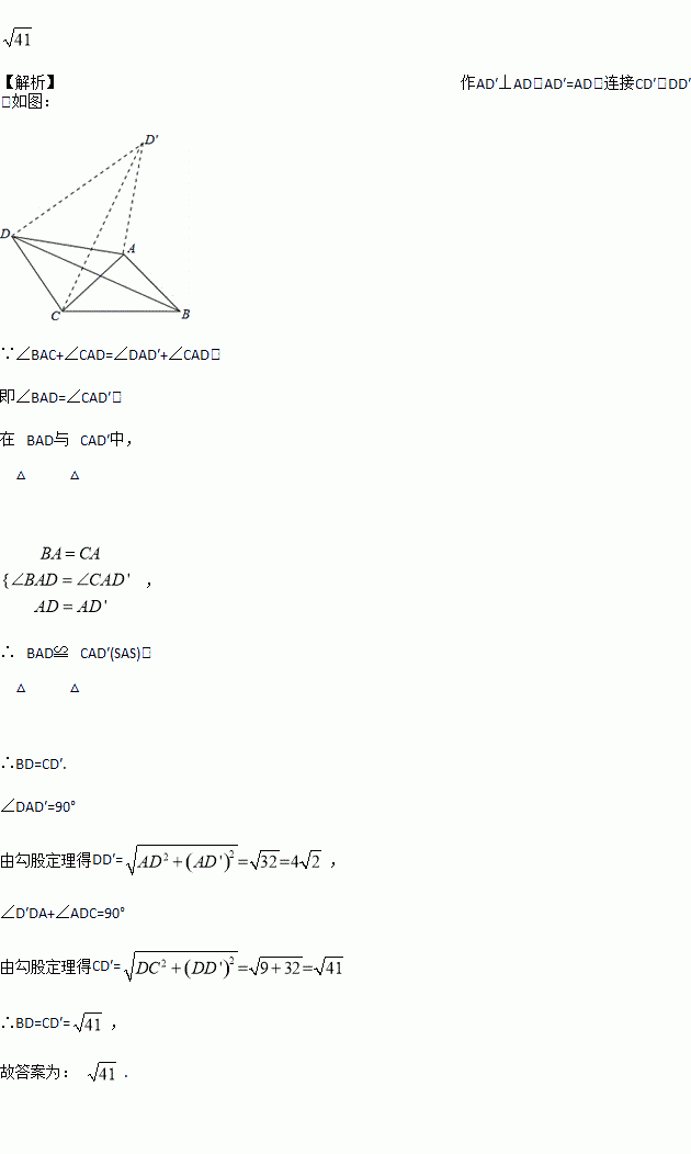 在四边形ABCD中,AD=4,CD=3,∠ABC=∠ACB=∠ADC=45°,则BD的长为____________.