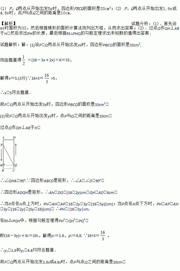 (1) P,Q两点从开始出发5s时,四边形PBCQ的面积是33cm2;(2) P,Q两点从开始出发1.6s或4.8s时,点P与点Q之间的距离是10cm. 【解析】试题分析:(1)、首先设xs时面积为33,然后根据梯形的面积计算法则列出方程,从而求出答案;(2)、过点Q作QH⊥AB于H,然后求出PH的长度,最后根据Rt△PHQ的勾股定理求出未知数的值得出答案. 试题解析:【解析】 (1...