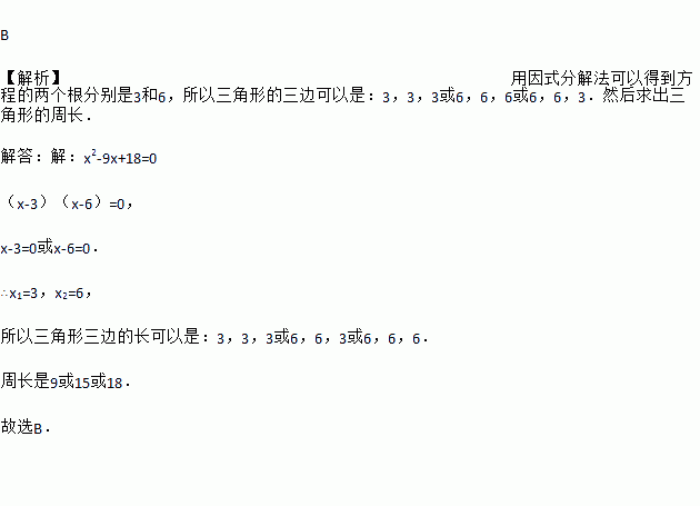 若三角形的三边长均能使代数式x2-9x+18的值为0,则此三角形的周长为( ).