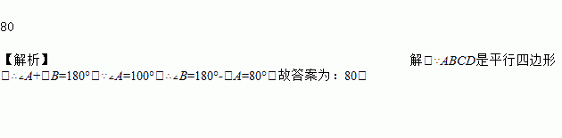在□ABCD中,∠A﹦100°,则∠B=_________。