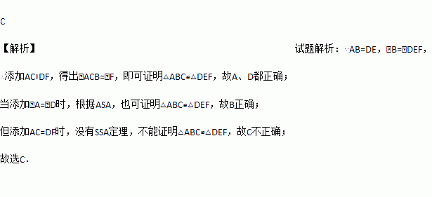 如图,△ABC和△DEF中,AB=DE,∠B=∠DEF,添加下列哪一个条件无法证明△ABC≌△DEF( )