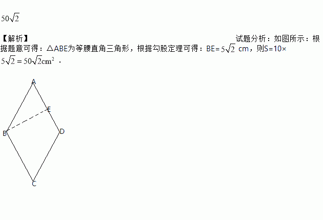 菱形的边长是10cm,且菱形的一个内角是,则这个菱形的面积的为__________cm2.