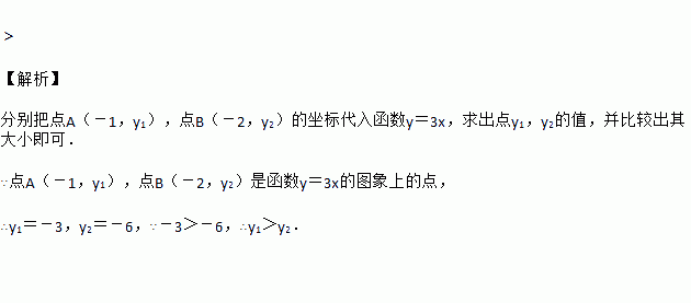 已知函数y=3x的图象经过点A(-1,y1),点B(-2,y2),则y1____y2(填“>”或“<”或“=”).