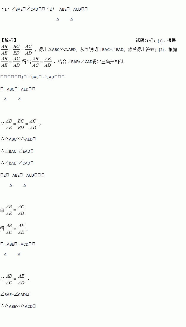 (1)∠BAE与∠CAD相等(2)△ABE与△ACD相似 【解析】试题分析:(1)、根据,得出△ABC∽△AED,从而说明∠BAC=∠EAD,然后得出答案;(2)、根据得出,结合∠BAE=∠CAD得出三角形相似. 试题解析:(1)∠BAE与∠CAD相等. 在△ABC和△AED中, ∵, ∴△ABC∽△AED, ∴∠BAC=∠EAD, ∴∠BAE=∠CAD;...