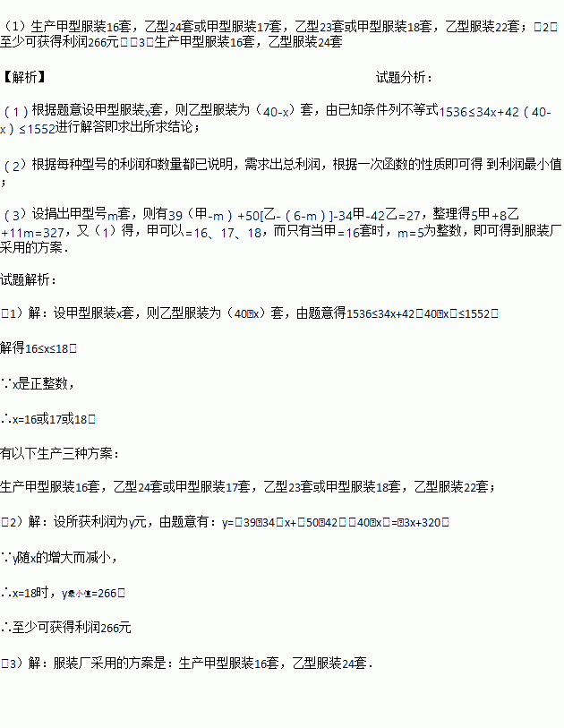 下岗职工王阿姨利用自己的﹣技之长开办了“爱心服装厂”,计划生产甲、乙两种型号的服装共40套投放到市场销售.已知甲型服装每套成本34元,售价39元;乙型服装每套成本42元,售价50元.服装厂预计两种服装的成本不低于1536元,不高于1552元.