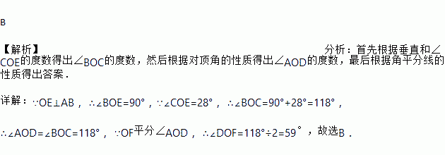 如图,直线AB,CD相交于点O,OE⊥AB,OF平分∠AOD,∠COE=28°.则∠DOF=( )