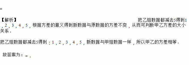 若甲组数据1,2,3,4,5的方差是,乙组数据6,7,8,9,10的方差是,则____.(填“”、“<”或“=”)