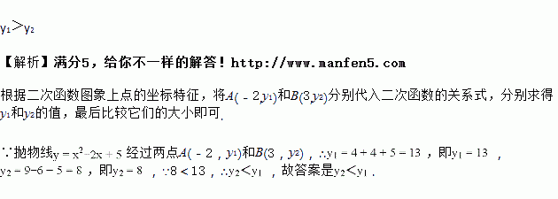 已知抛物线y=x2﹣2x+5经过两点A(﹣2,y1)和B(3,y2),则y1与y2的大小关系是_____.