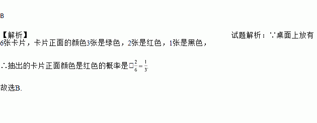 桌面上放有6张卡片(卡片除正面的颜色不同外,其余均相同),其中卡片正面的颜色3张是绿色,2张是红色,l张是黑色.现将这6张卡片洗匀后正面向下放在桌面上,从中随机抽取一张,抽出的卡片正面颜色是红色的概率是 ( )