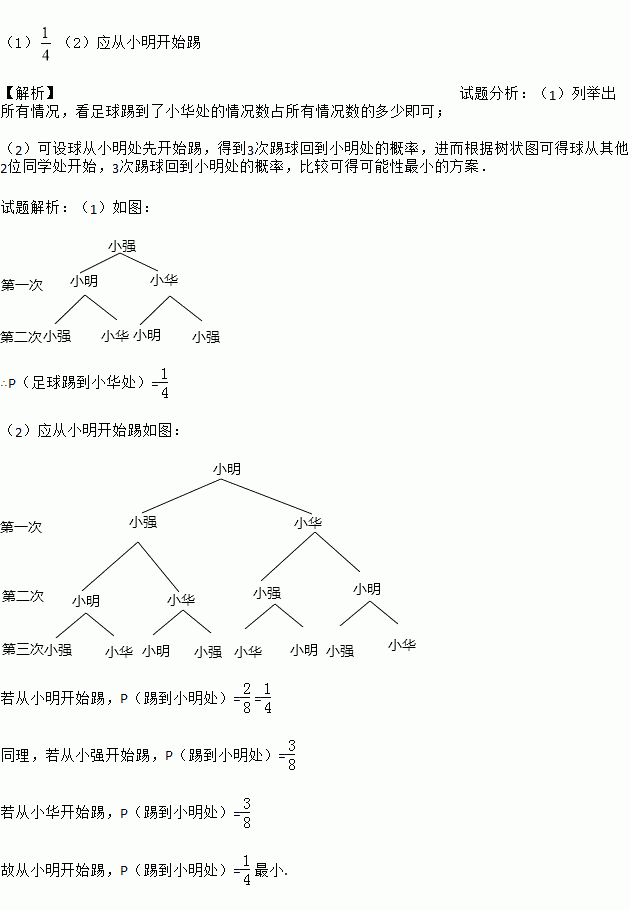£¨1£©£¨2£©Ó¦´ÓСÃ÷¿ªÊ¼Ìß ¡¾½âÎö¡¿ÊÔÌâ·ÖÎö£º£¨1£©ÁоٳöËùÓÐÇé¿ö£¬¿´×ãÇòÌßµ½ÁËС»ª´¦µÄÇé¿öÊýÕ¼ËùÓÐÇé¿öÊýµÄ¶àÉÙ¼´¿É£» £¨2£©¿ÉÉèÇò´ÓСÃ÷´¦ÏÈ¿ªÊ¼Ìߣ¬µÃµ½3´ÎÌßÇò»Øµ½Ð¡Ã÷´¦µÄ¸ÅÂÊ£¬½ø¶ø¸ù¾ÝÊ÷״ͼ¿ÉµÃÇò´ÓÆäËû2λͬѧ´¦¿ªÊ¼£¬3´ÎÌßÇò»Øµ½Ð¡Ã÷´¦µÄ¸ÅÂÊ£¬±È½Ï¿ÉµÃ¿ÉÄÜÐÔ×îСµÄ·½°¸£® ÊÔÌâ½âÎö£º£¨1£©Èçͼ£º ¡àP£¨×ãÇòÌßµ½Ð¡»ª´¦£©= £¨2£©Ó¦´ÓСÃ÷¿ªÊ¼ÌßÈçͼ£º Èô´ÓСÃ÷¿ª...