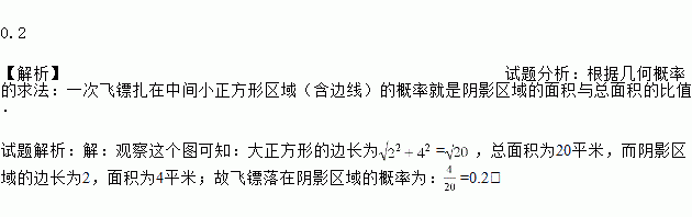 赵爽弦图”是四个全等的直角三角形与中间一个小正方形拼成的大正方形.如图,是一“赵爽弦图”飞镖板,其直角三角形的两条直角边的长分别是2和4.小明同学距飞镖板一定距离向飞镖板投掷飞镖(假设投掷的飞镖均扎在飞镖板上),求小明投掷一次飞镖扎在中间小正方形区域(含边线)的概率是多少?