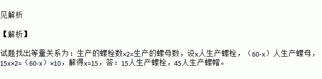 (8分)某车间有60名工人,生产一种螺栓和螺帽,平均每人每小时生产螺栓15个或螺帽10个,应分配多少人生产螺栓和螺帽,才能刚好配套?(每个螺栓配两个螺帽)