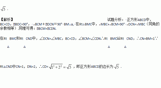 如图,正方形ABCD的顶点C在直线a上,且点B,D到a的距离分别是1,2.则 这个正方 形的边长是 。