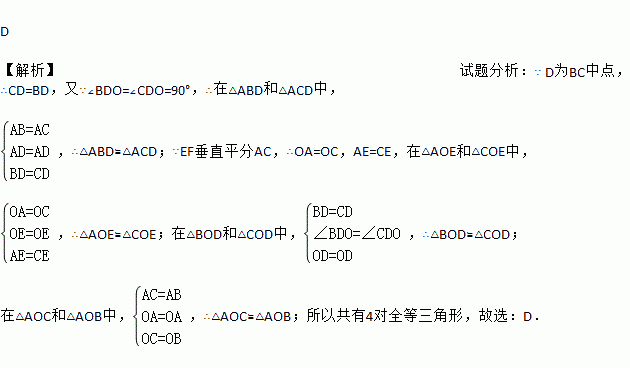 D 【解析】试题分析:∵ D为BC中点,∴CD=BD,又∵∠BDO=∠CDO=90°,∴在△ABD和△ACD中, ,∴△ABD≌△ACD;∵EF垂直平分AC,∴OA=OC,AE=CE,在△AOE和△COE中, ,∴△AOE≌△COE;在△BOD和△COD中,,∴△BOD≌△COD; 在△AOC和△AOB中,,∴△AOC≌△AOB;所以共有4对全等三角形,故选:D.