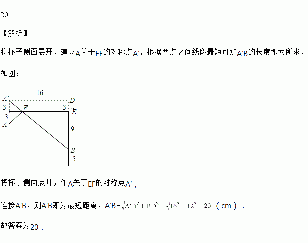 如图,圆柱形玻璃杯高为14cm,底面周长为32cm,在杯内壁离杯底5cm的点B处有一滴蜂蜜,此时一只蚂蚁正好在杯外壁,离杯上沿3cm与蜂蜜相对的点A处,则蚂蚁从外壁A处到内壁B处的最短距离为_____cm(杯壁厚度不计).