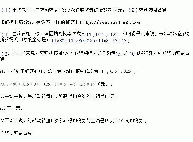 (1)平均来说,每转动转盘次所获得购物券的金额是多少?![]()