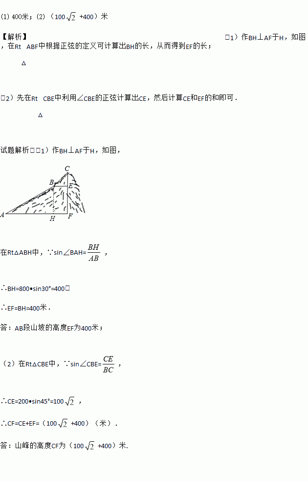 如图,为测量一座山峰CF的高度,将此山的某侧山坡划分为AB和BC两段,每一段山坡近似是“直”的,测得坡长AB=800米,BC=200米,坡角∠BAF=30°,∠CBE=45°.