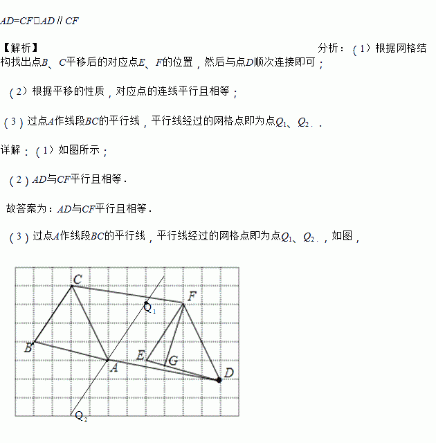 在正方形网格中,每个小正方形的边长均为1个单位长度,△ABC的三个顶点的位置如图所示.现将△ABC平移,使点A变换为点D,点E、F分别是B、C的对应点.