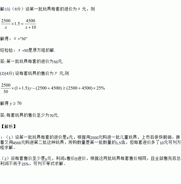 (2)如果这两批玩具每套售价相同,且全部售完后总利润不低于25%,那么每套售价至少是多少元?