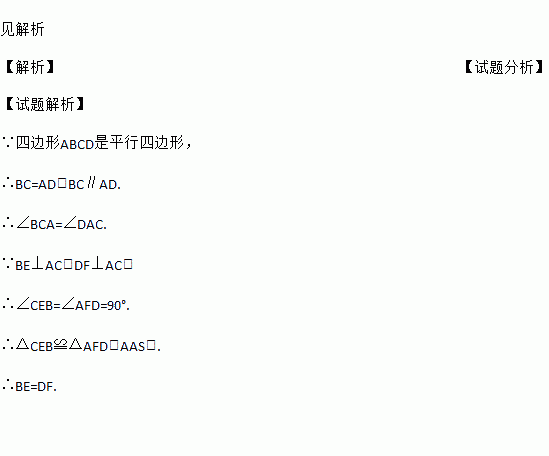 如图,四边形ABCD是平行四边形,AC是对角线,BE⊥AC,垂足为E,DF⊥AC,垂足为F.求证:DF=BE.