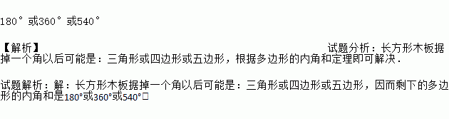 180°或360°或540° 【解析】试题分析:长方形木板据掉一个角以后可能是:三角形或四边形或五边形,根据多边形的内角和定理即可解决. 试题解析:【解析】 长方形木板据掉一个角以后可能是:三角形或四边形或五边形,因而剩下的多边形的内角和是180°或360°或540°.