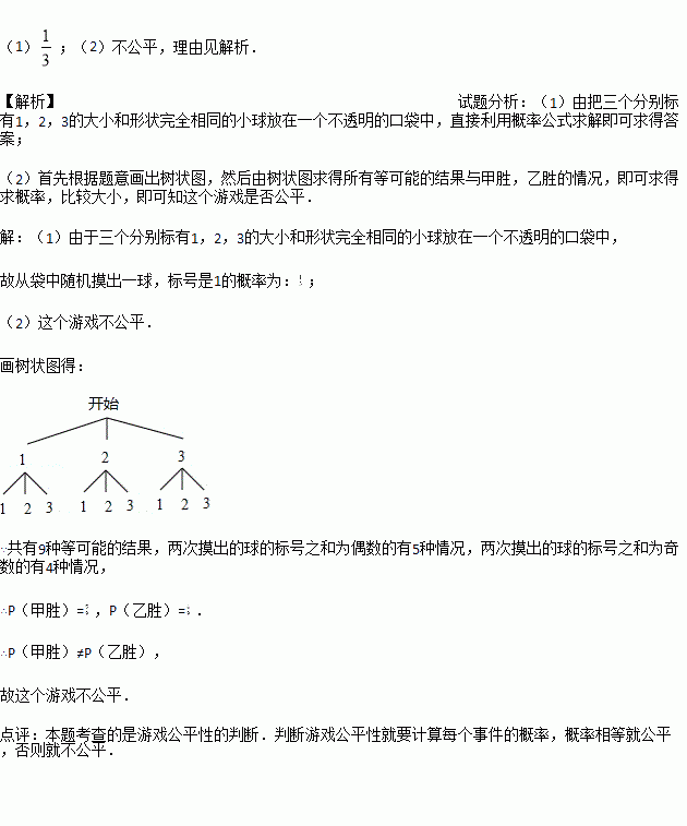 (2)从袋中随机摸出一球后放回,摇匀后再随机摸出一球,若两次摸出的球的标号之和为偶数时,则甲胜;若两次摸出的球的标号之和为奇数时,则乙胜;试分析这个游戏是否公平?请说明理由.