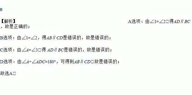 C. 若∠A=∠3,则AD∥BC D. 若∠A+∠ADC=180°,则AD∥BC