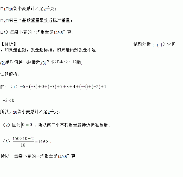(1)10袋小麦总计不足2千克; (2)第三个基数重量最接近标准重量; (3)每袋小麦的平均重量是149.8千克. 【解析】试题分析:(1)求和,如果是正数,就是超标准,如果是负数就是不足. (2)绝对值越小越接近.(3)先求和再求平均数. 试题解析: 【解析】 (1) = 所以,10袋小麦总计不足2千克. (2)因为,所以第三个基数重量最接...