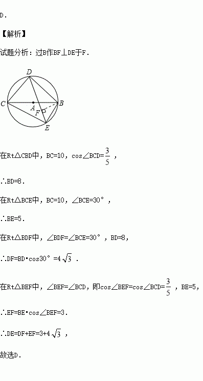 如图,四边形BDCE内接于以BC为直径的⊙A,已知:BC=10,cos∠BCD=,∠BCE=30°,则线段DE的长是( )