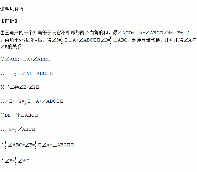(本题6分)如图:∠ACD是△ABC的外角,BE平分∠ABC,CE平分∠ACD,且BE、CE交于点E,求证:∠E=∠A.