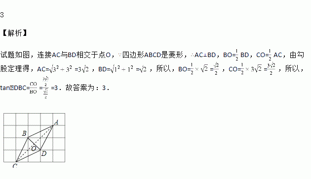 如图,网格中的四个格点组成菱形ABCD,则tan∠DBC的值为___________ .