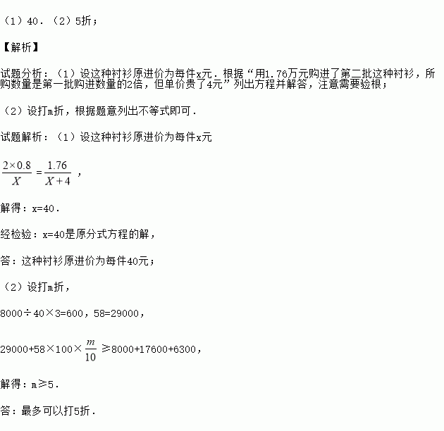 (1)40.(2)5折; 【解析】 试题分析:(1)设这种衬衫原进价为每件x元.根据“用1.76万元购进了第二批这种衬衫,所购数量是第一批购进数量的2倍,但单价贵了4元”列出方程并解答,注意需要验根; (2)设打m折,根据题意列出不等式即可. 试题解析:(1)设这种衬衫原进价为每件x元 =, 解得:x=40. 经检验:x=40是原分式方程的解, 答:...