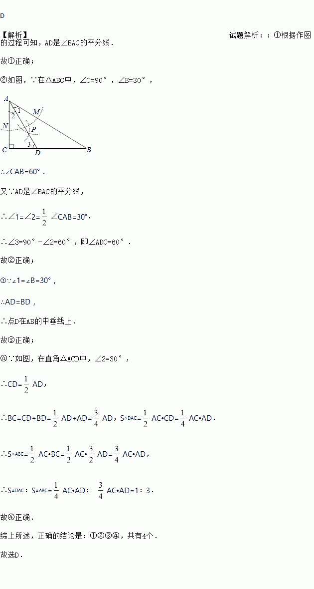 ①AD是∠BAC的平分线;②∠ADC=60°;③点D在AB的中垂线上;④S△DAC∶S△ABC=1∶3.