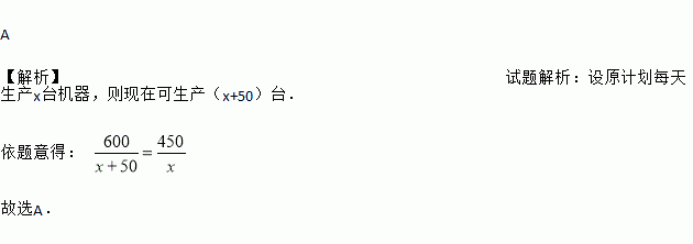 某工厂现在平均每天比原计划多生产50台机器,现在生产600台机器所需时间与原计划生产450台机器所需时间相同.设原计划平均每天生产x台机器,根据题意,下面所列方程正确的是( )